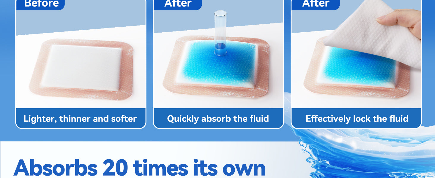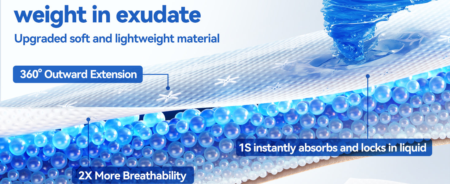 1S Instantly Absorbs&Locks in Exudate - The unique SAP-composite absorbent core has high absorption properties, converting exudate to gel in 1 second, reducing the risk of maceration. It also absorbs up to 20 times its own weight in exudate, reducing the frequency of dressing changes.