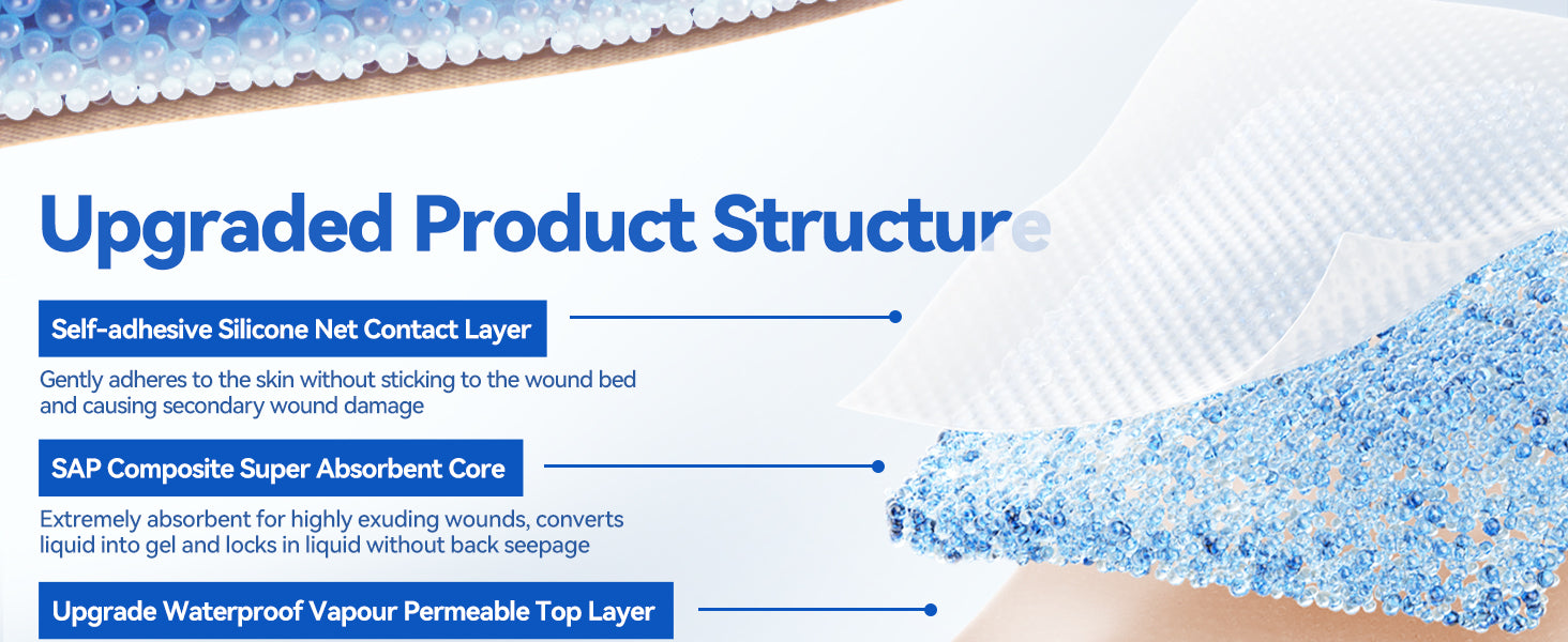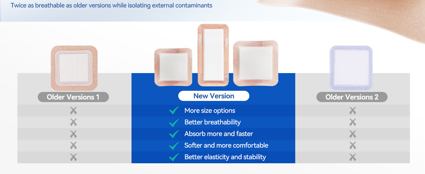 Silicone Ultra Absorbent Dressing VS Nonstick Dressing - Self-adhesive silicone contact layer gently adheres to the skin,the silicone net and inner precut foam allow the exudate especially thick liquid to be evenly dispersed over the dressing without sticking to the wound bed and causing secondary wound damage. It's repeatable adhesion makes it easy to check wound recovery and change dressing, which is safer and more convenient compared to non-adhesive dressings.