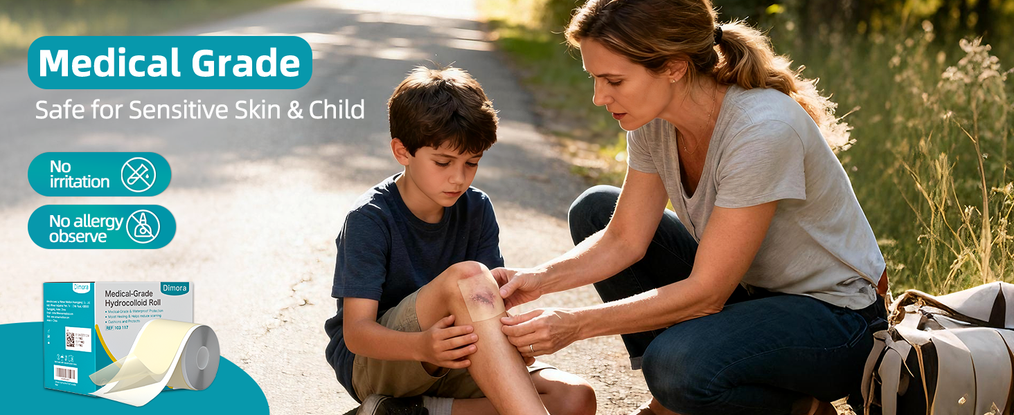 Thoughtful Design for Convenient Use: Compare with other hydrocolloid roll, Dimora hydrocolloid roll design reserved edge for easy-peel, and offer silicone tape for fixing, making sure the roll will not fall apart after every use