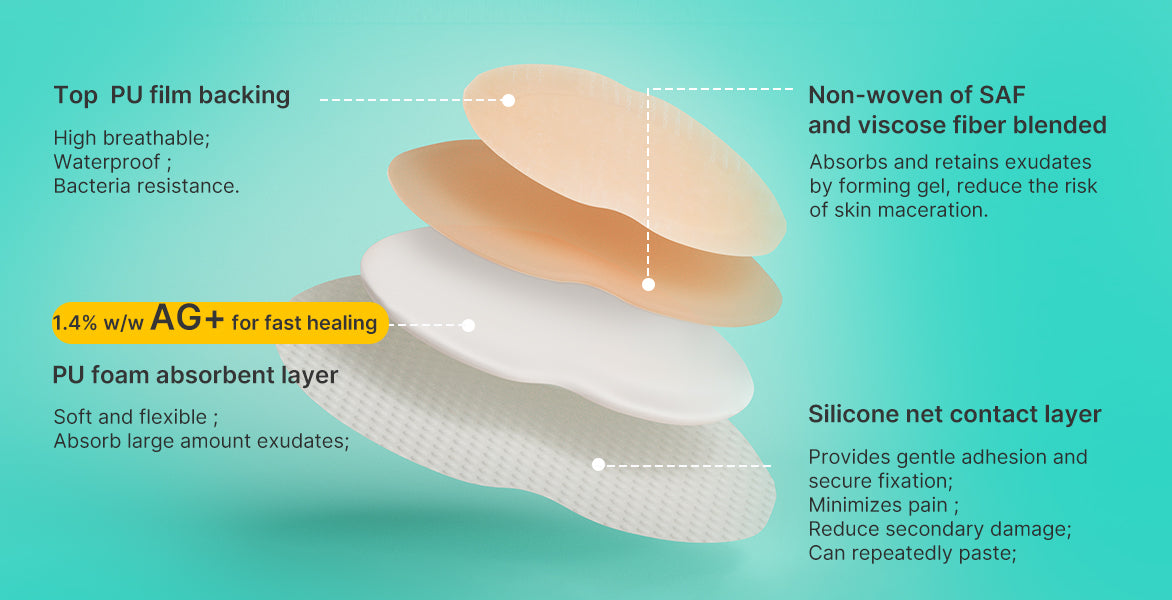 GENTLE BUT SECURE ADHESION - We adopts an A+ medical-grade hypoallergenic silicone as a wound contact layer, it absorbs dead tissue cells, won't stick to the moist wound, while is sticky enough to stick to dry skin, minimize pain and trauma at dressings change.